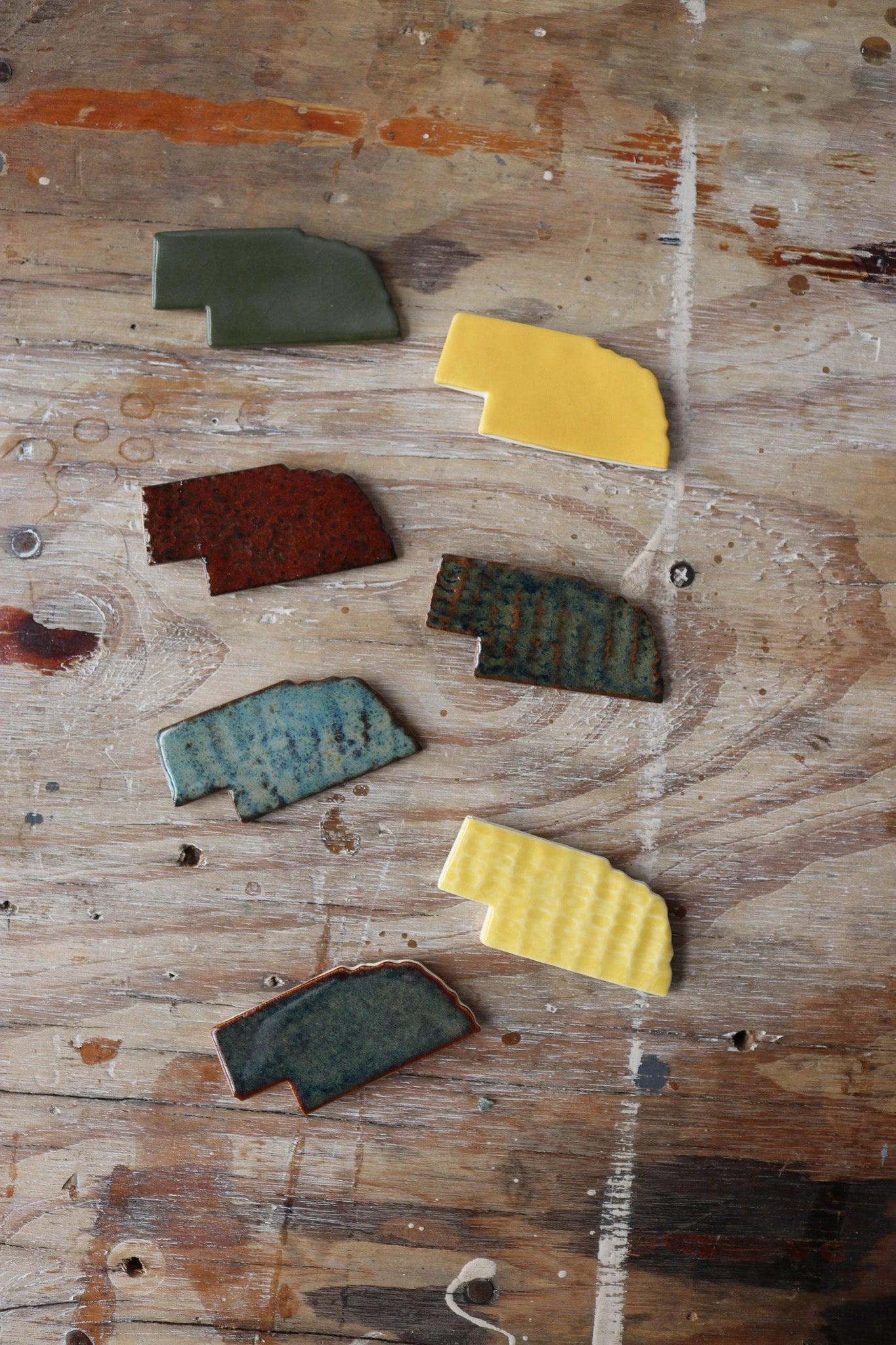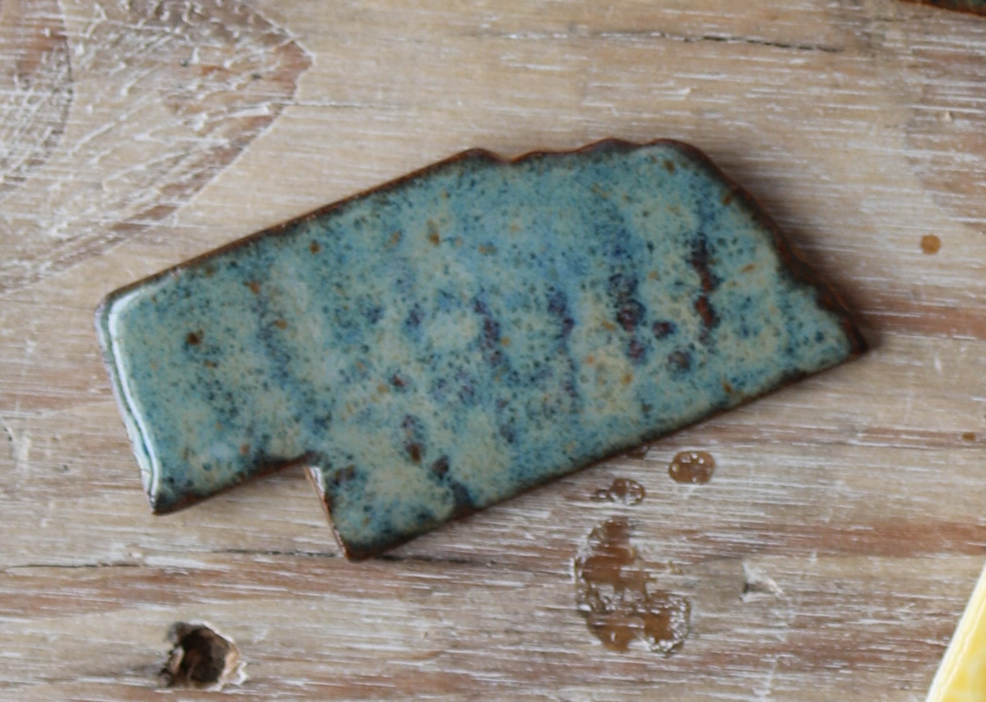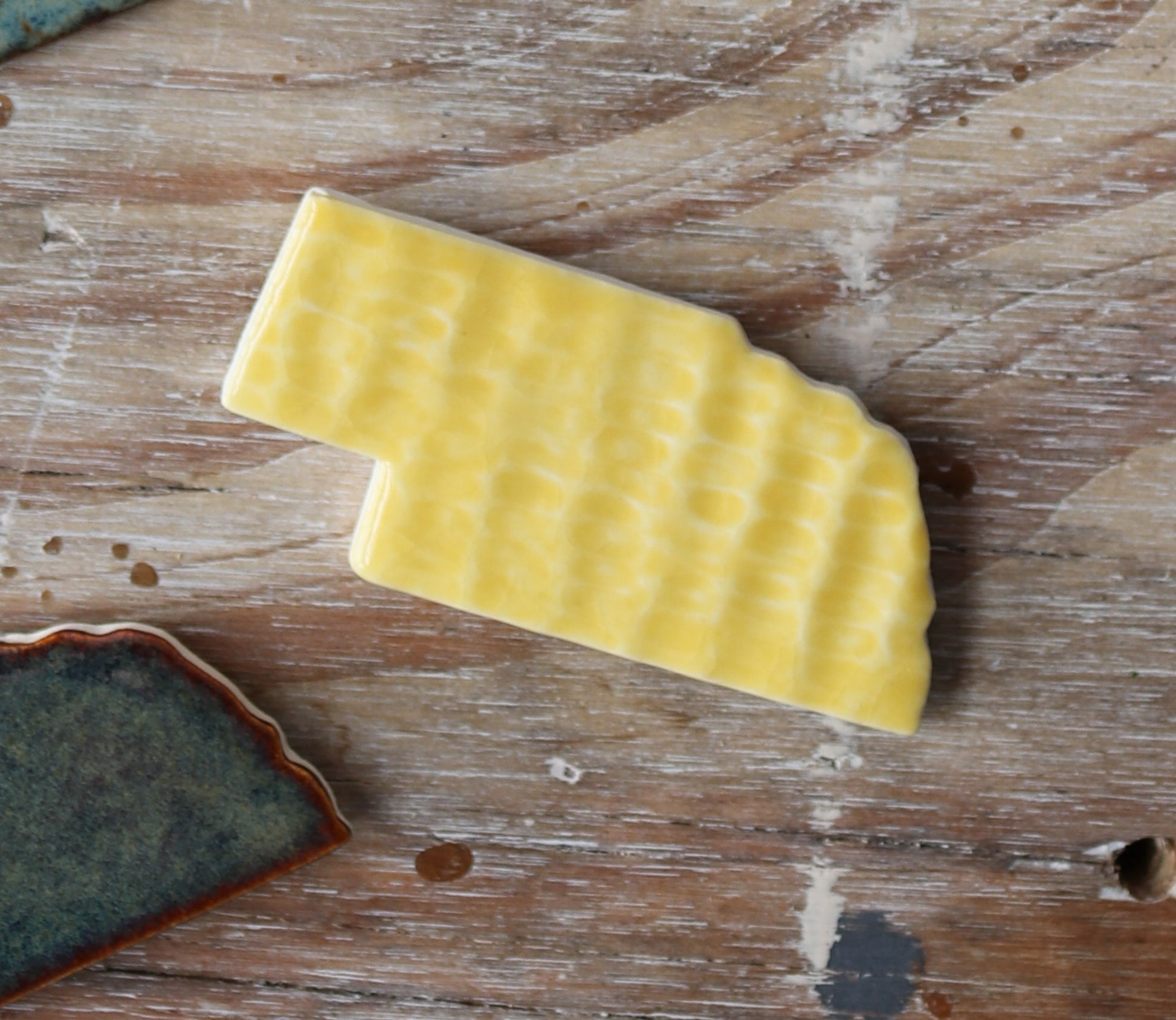 Textured items were created using an ear of corn and rolling in on the clay while it's still pliable and cutting them into the shape of Nebraska.