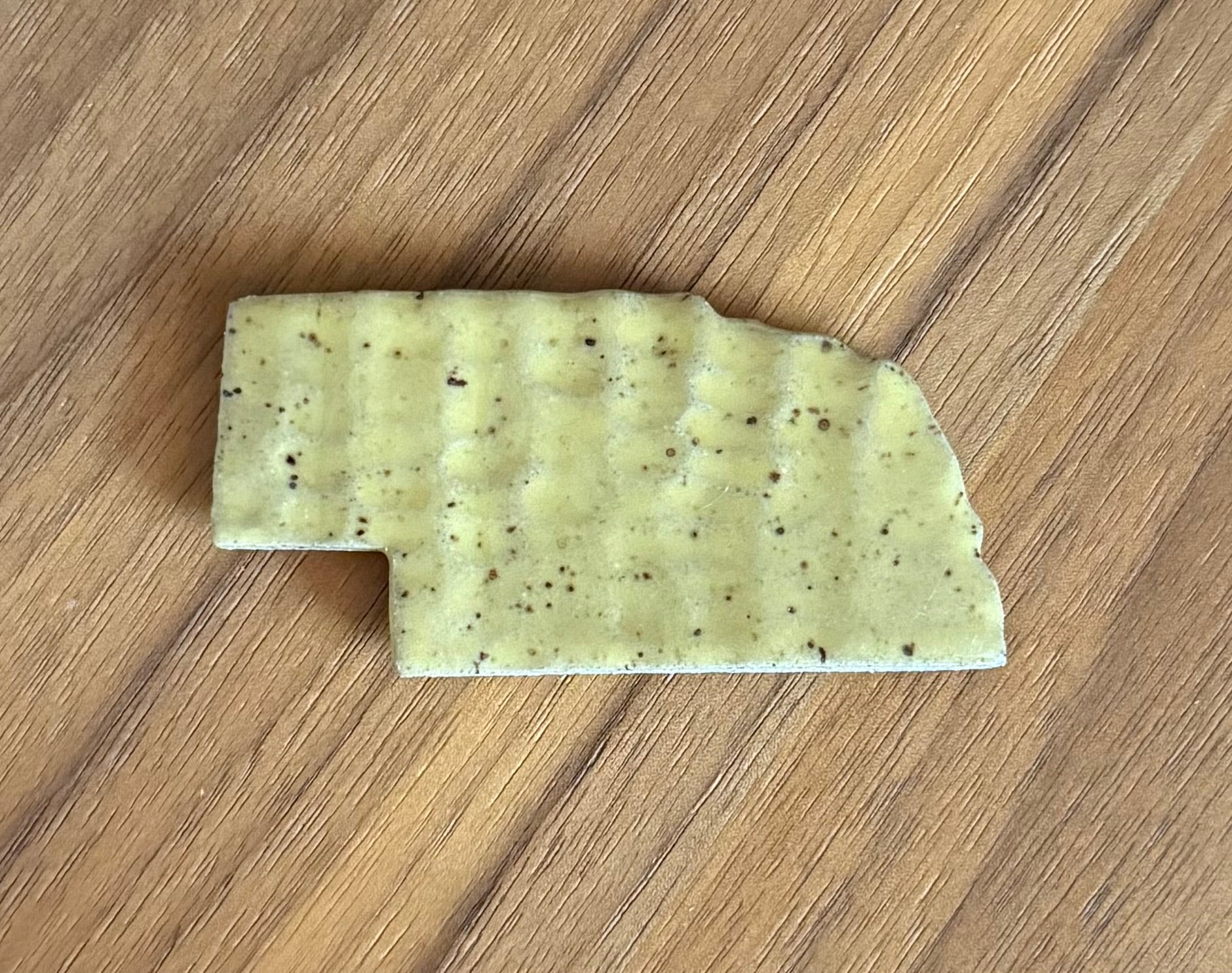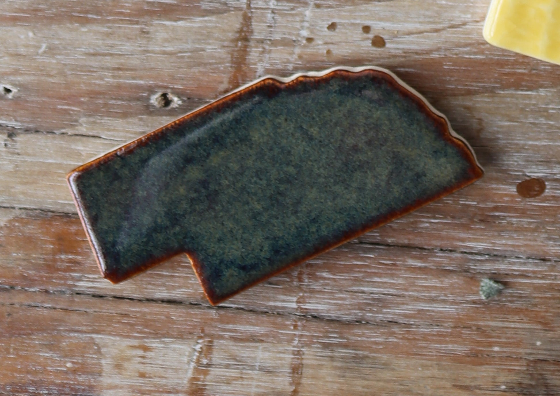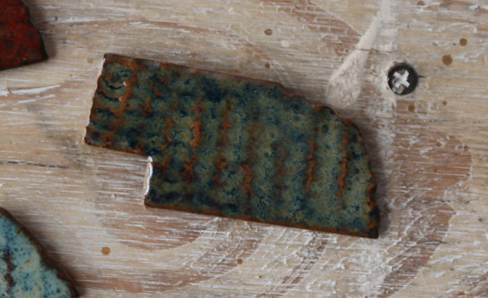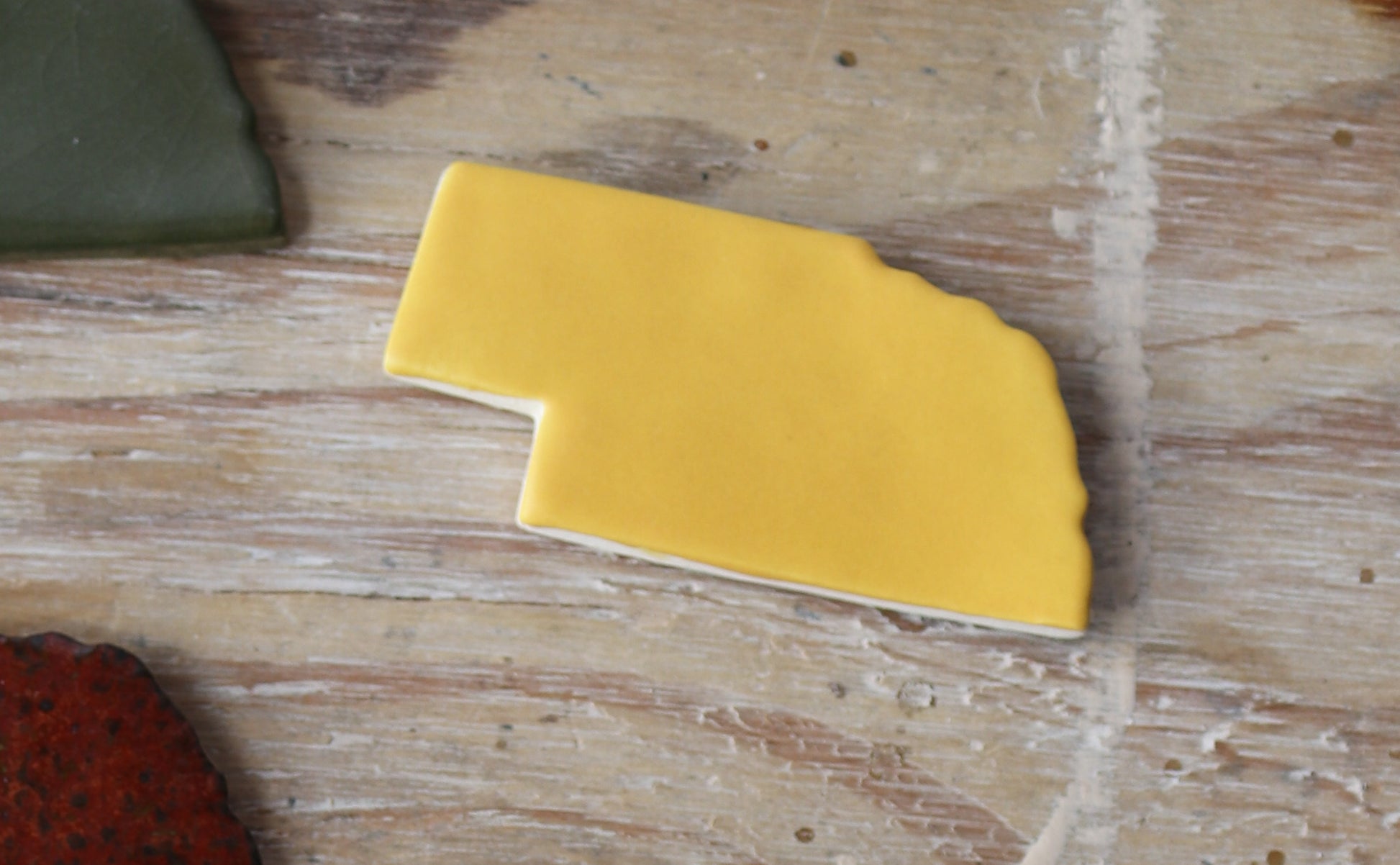 Textured items were created using an ear of corn and rolling in on the clay while it's still pliable and cutting them into the shape of Nebraska.