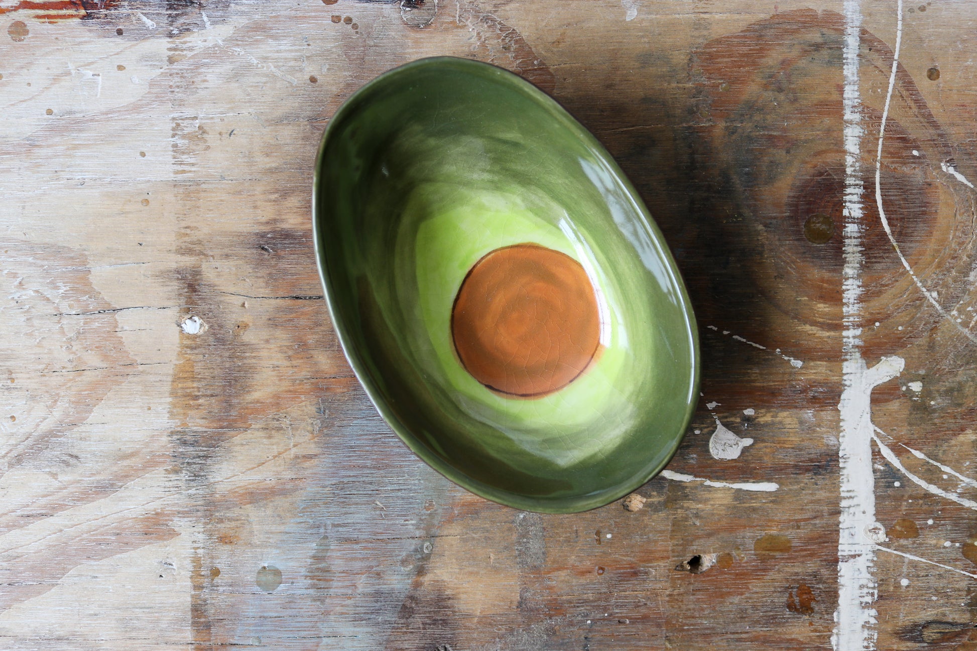 A whimsical bowl that resembles an avocado. Featuring a soft brown exterior and a hand painted pit and avocado meat with a clear glaze.
