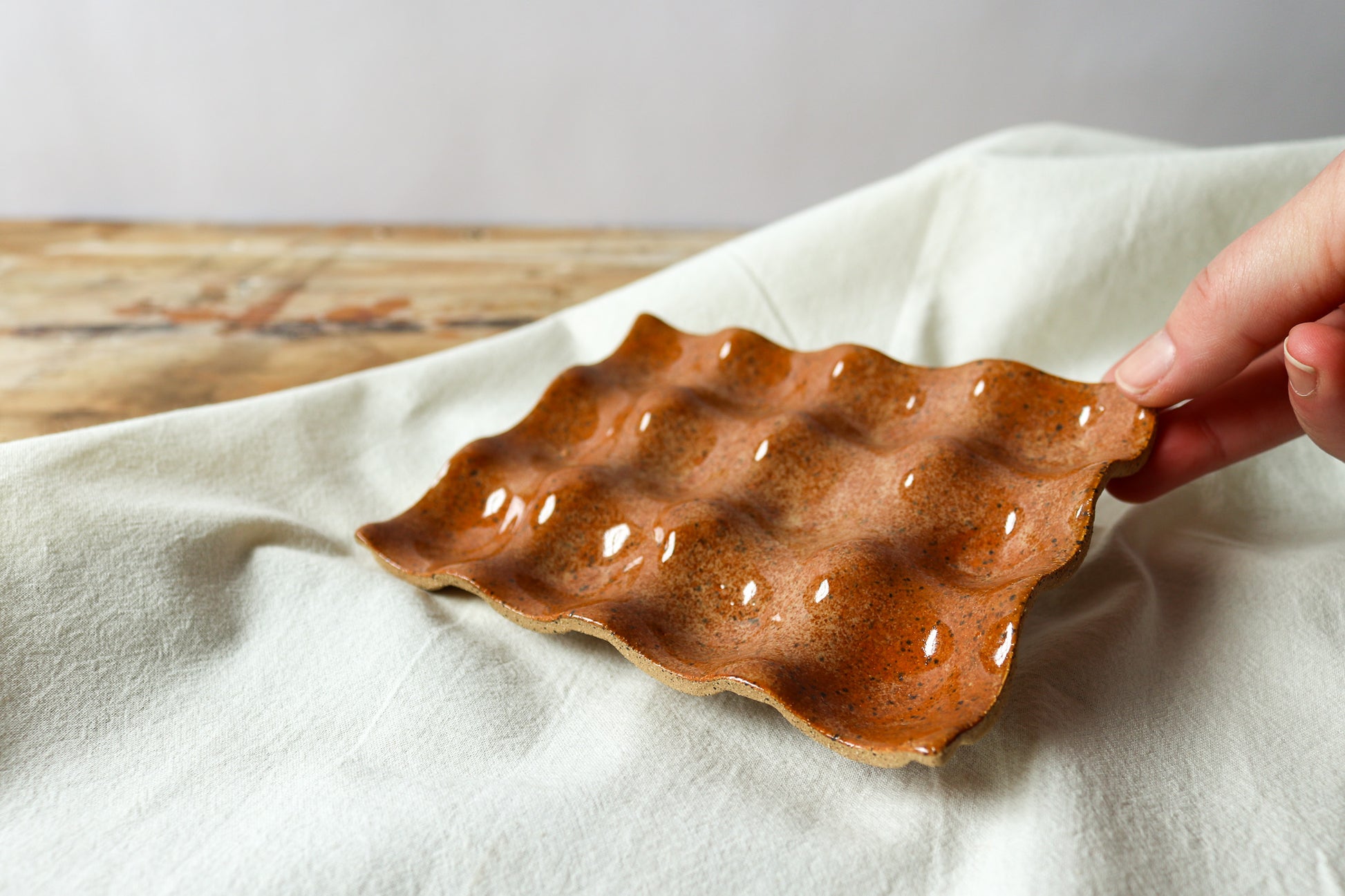 Speckled clay, stoneware. Microwave and dishwasher safe.