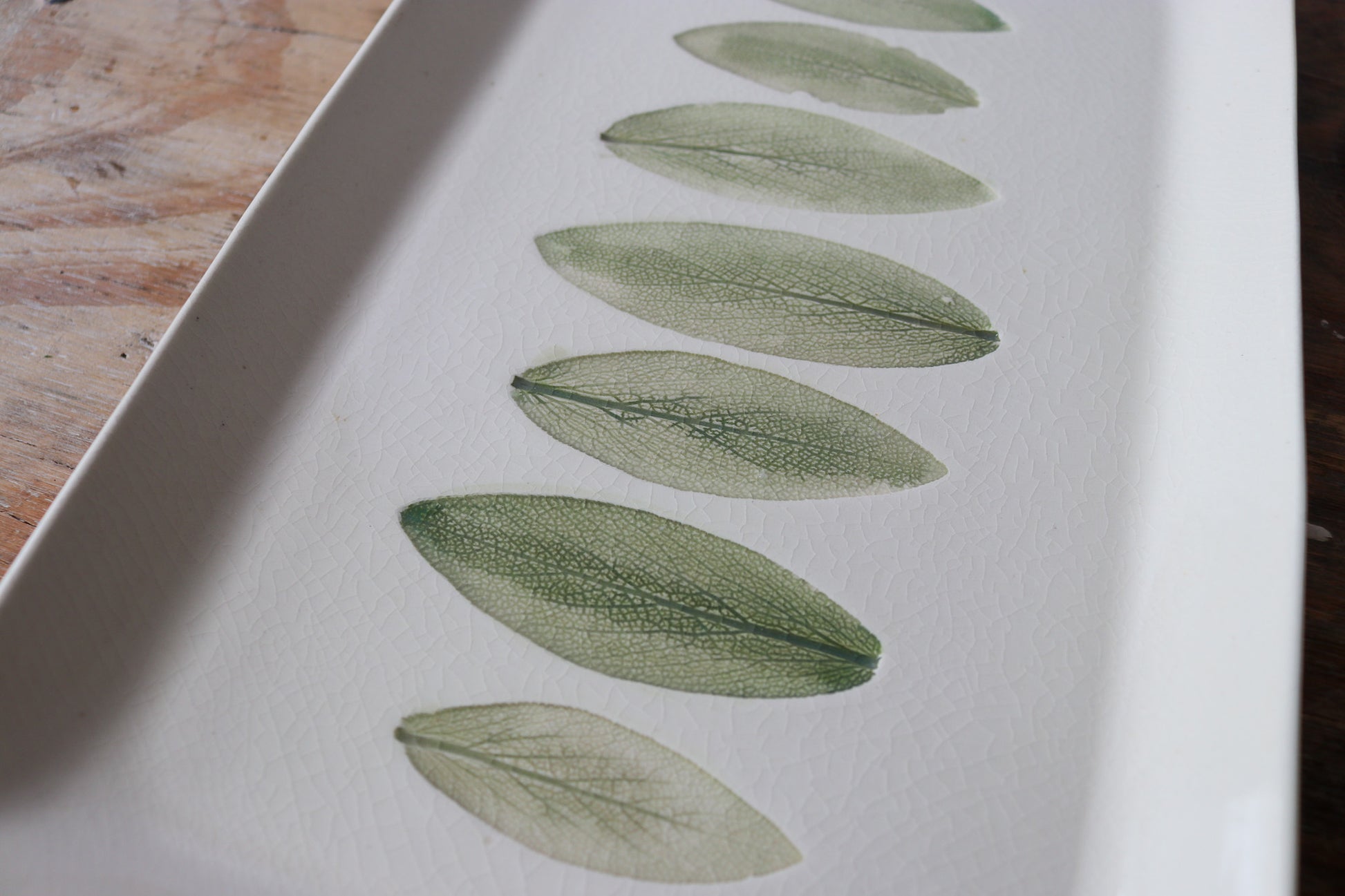 The imprints are done while the clay is still green and malleable. The leafs are arranged and pressed into the clay. After some time and the clay has firmed up a bit, the leaves are removed and the piece is bisque fired. To add color to each leaf a watercolor technique is used with underglaze to create depth adding another level of uniqueness to each leaf. A clear glaze is applied all over the piece and it's fired once more, giving it's final appearance.