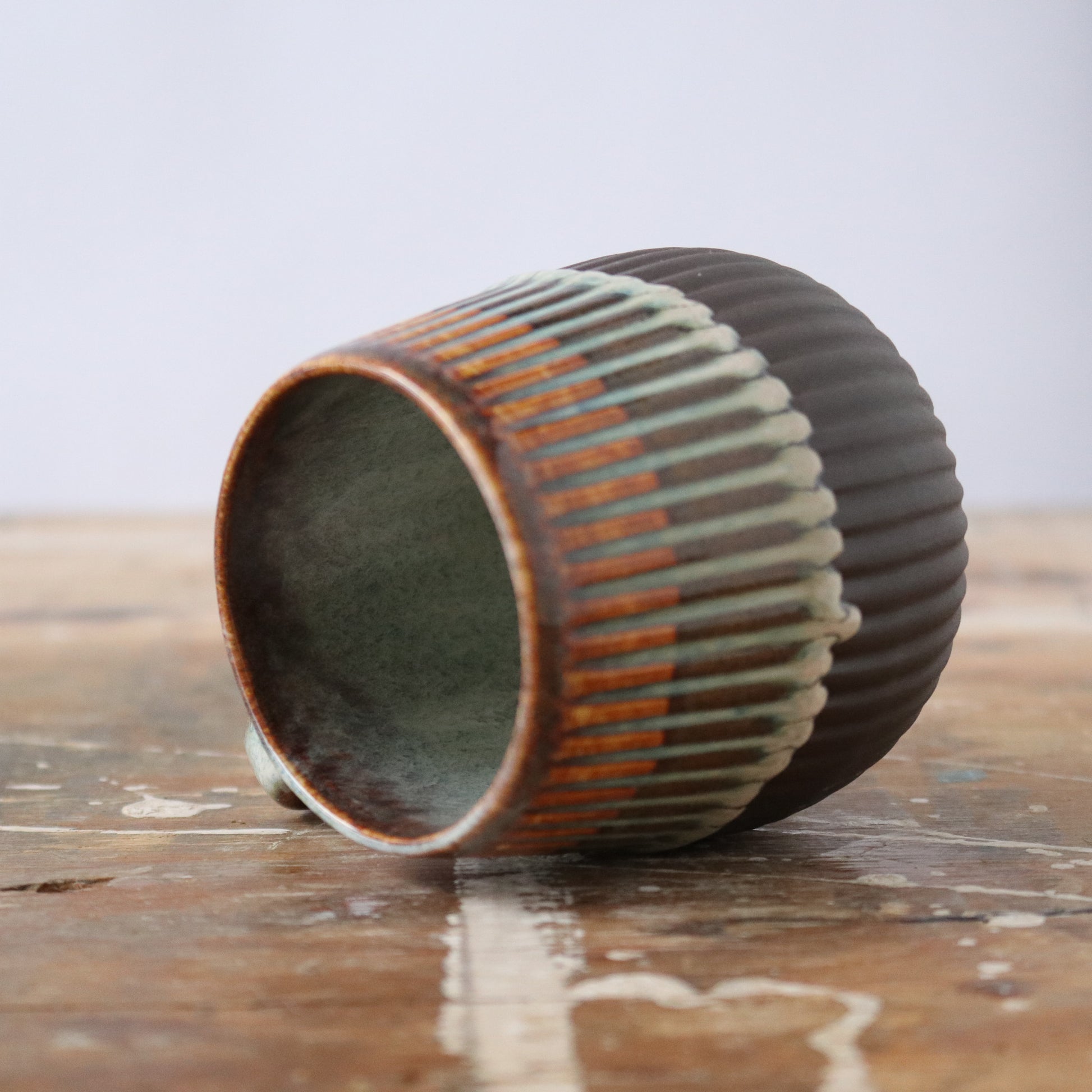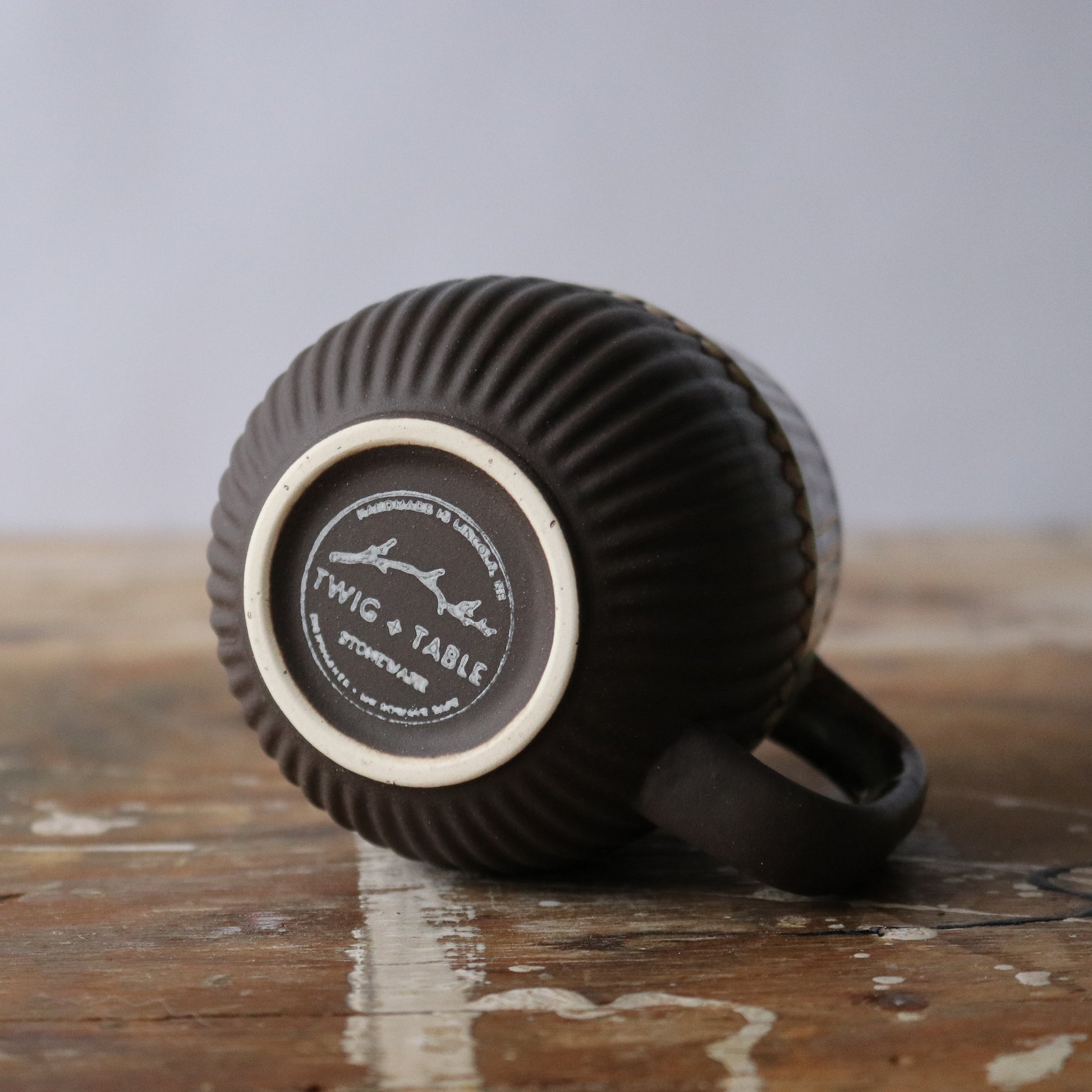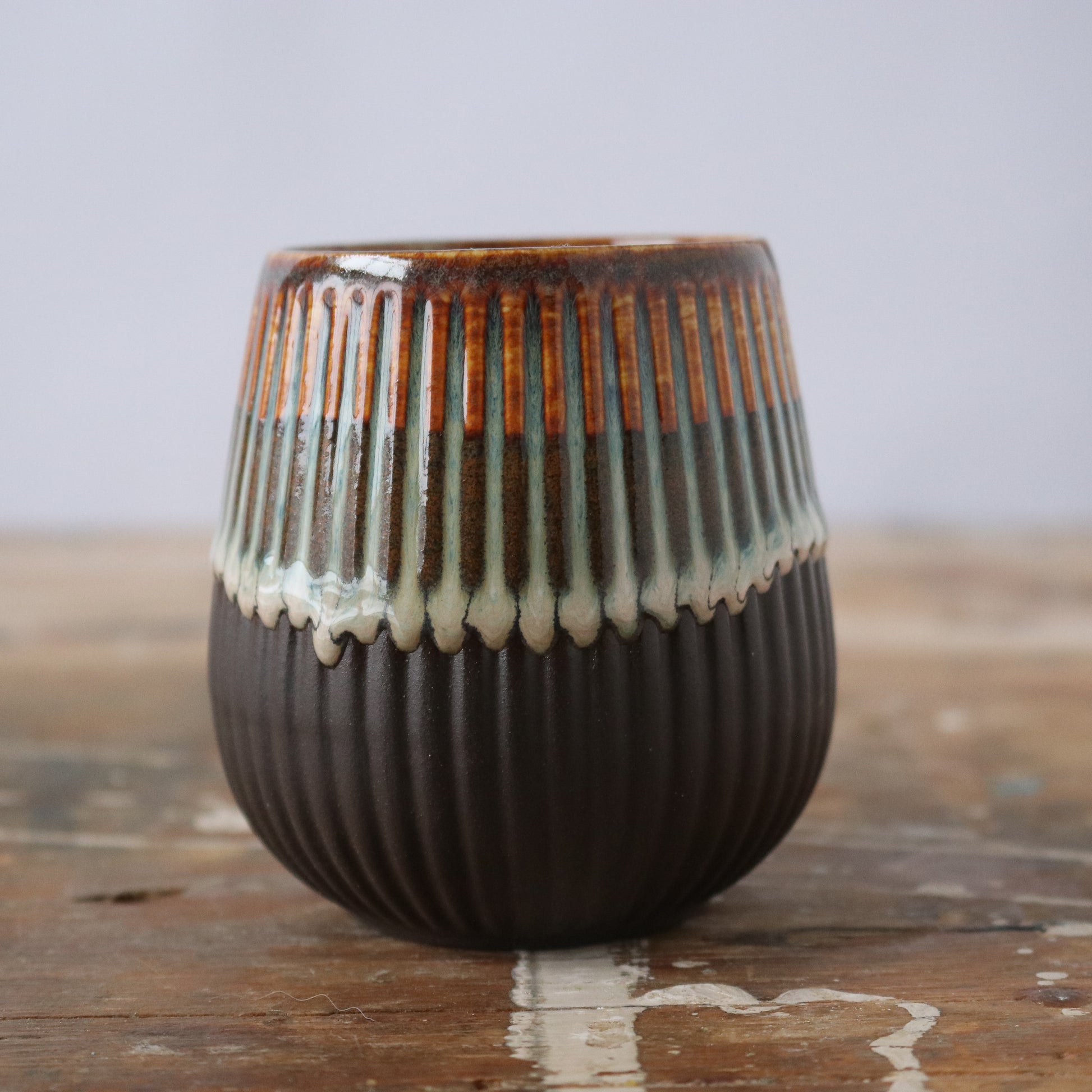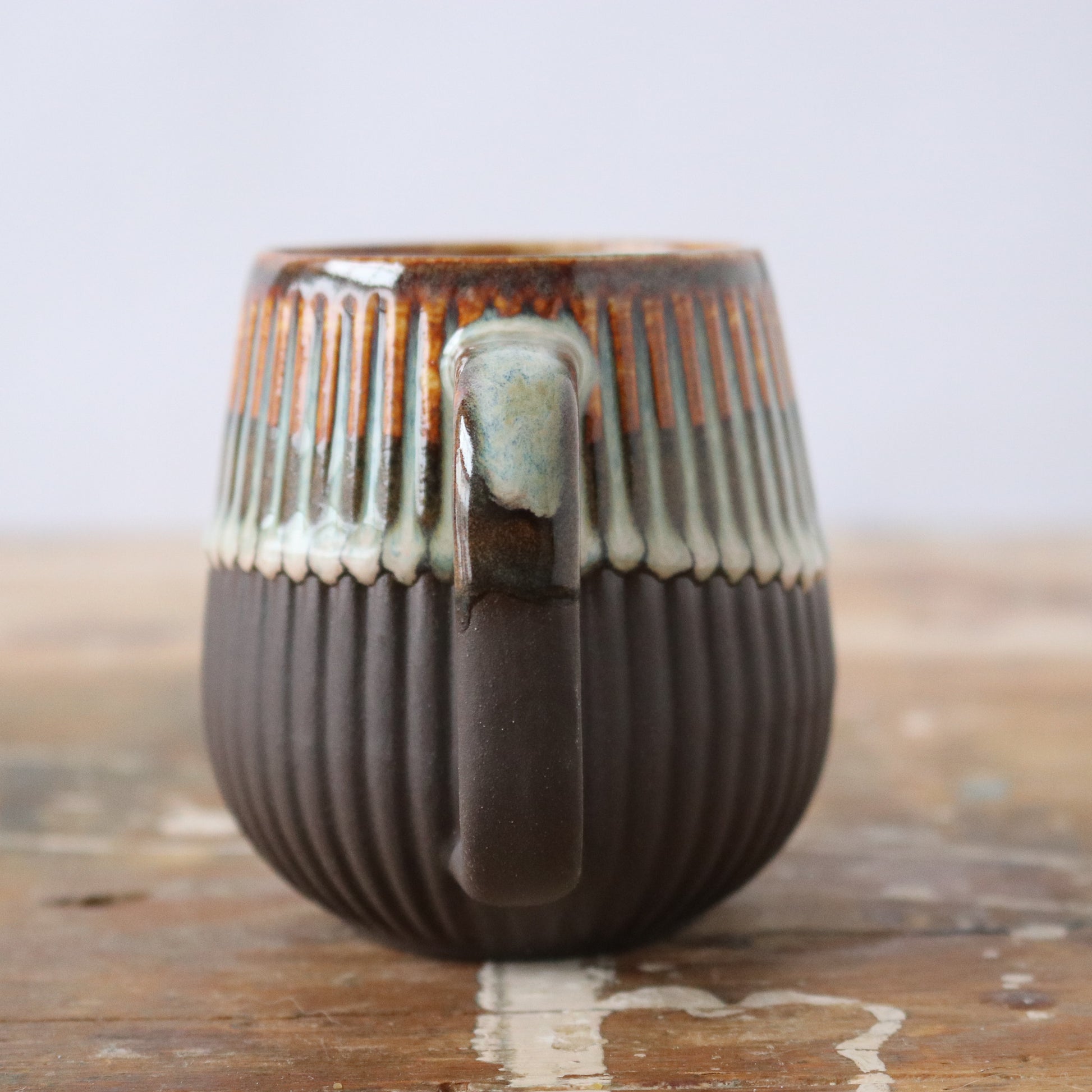 For pre-sale only! This 12 oz cup features fluting texture that really plays with the glaze! It features a matte brown engobe base with a unique blend of glazes resulting in blues, purples, creams and browns melting together. It's cozy like your favorite sweater.