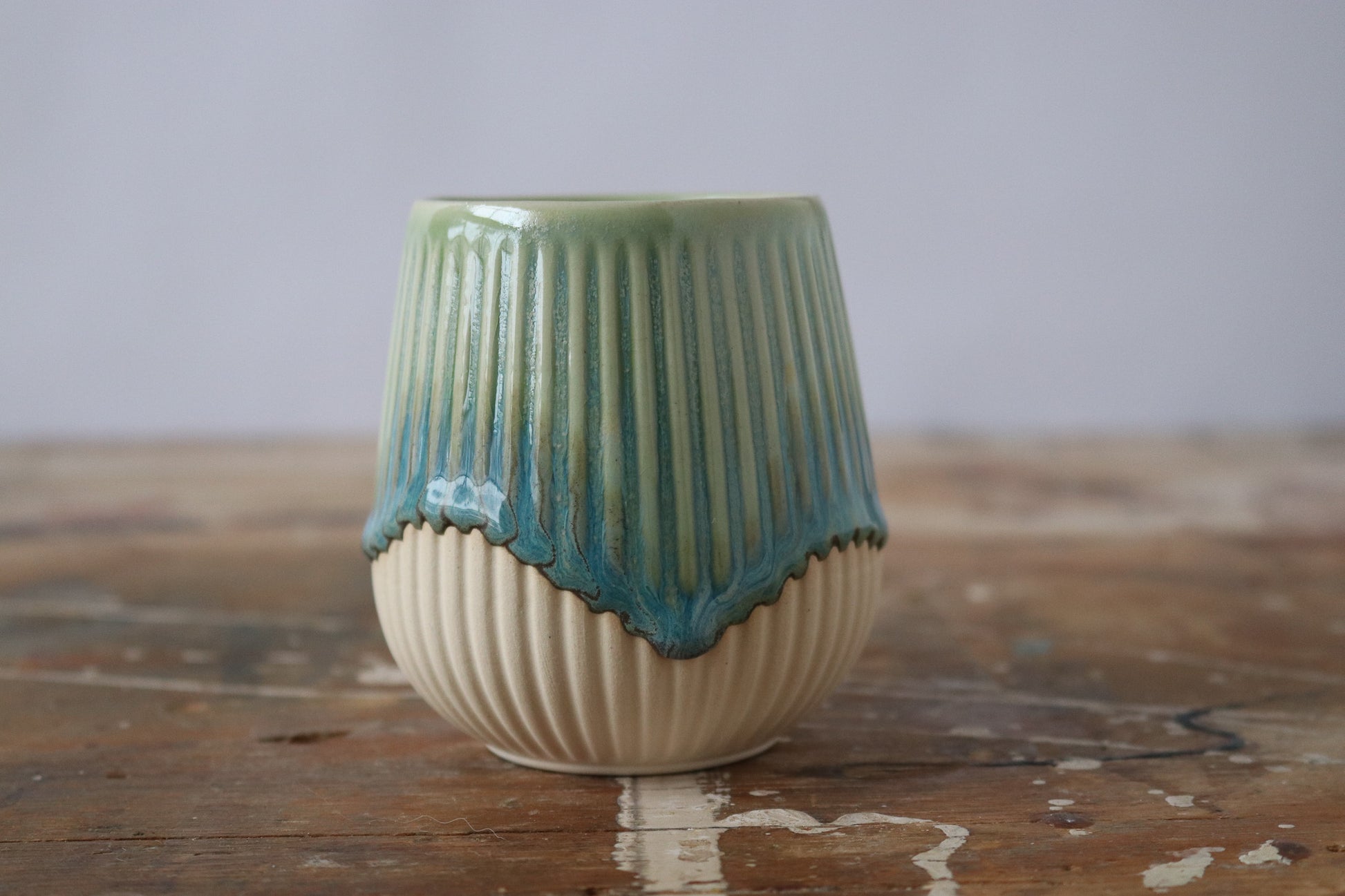 For pre-sale only! This 12 oz cup features fluting texture that really plays with the glaze! A soft greenish teal with hints of cream near the top, pooling into a deep wave of glaze dripping near the base of the mug.