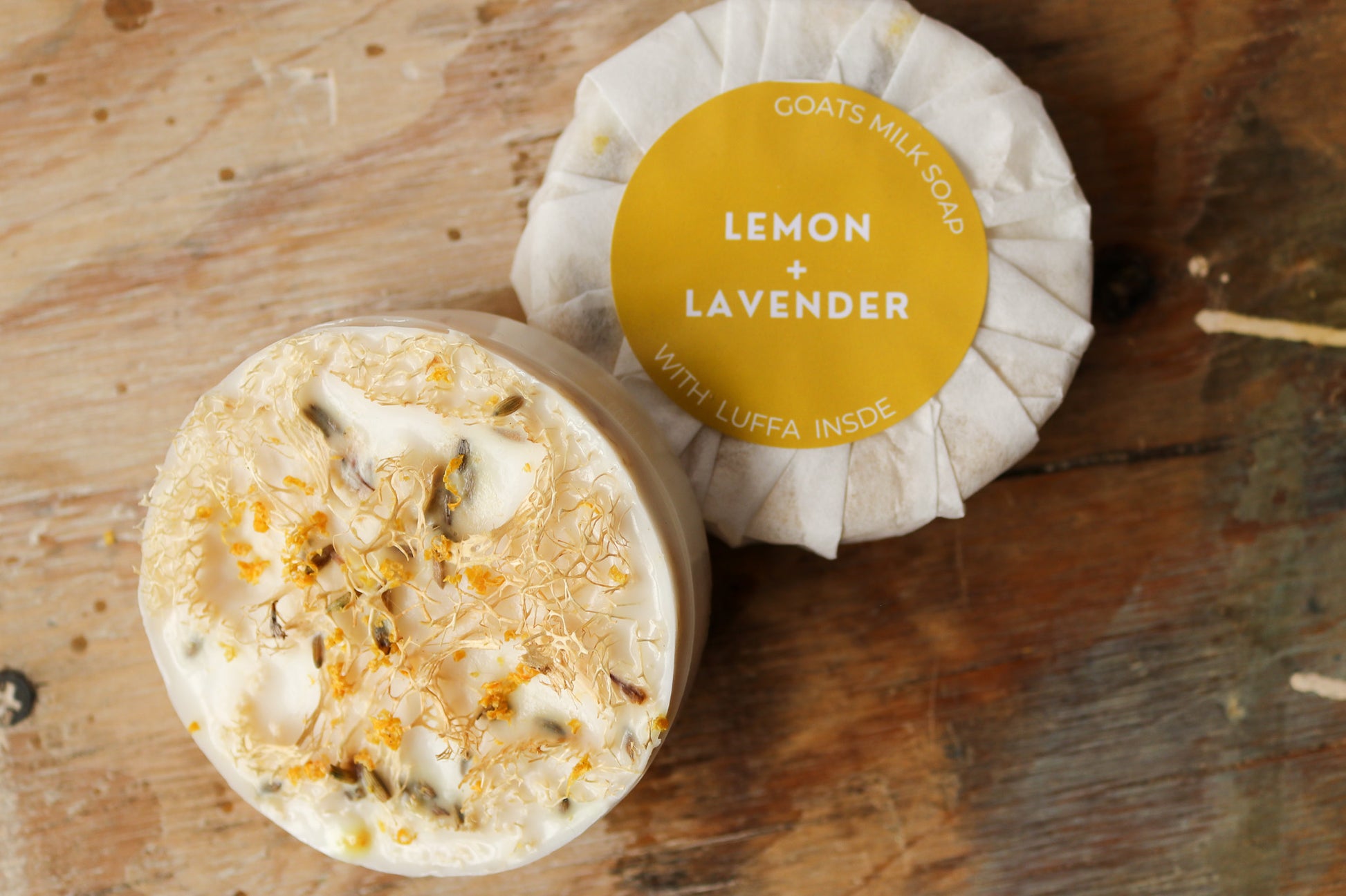 Goats Milk Soap with lemon and lavender notes for relaxation and a luffa for exfoliation.