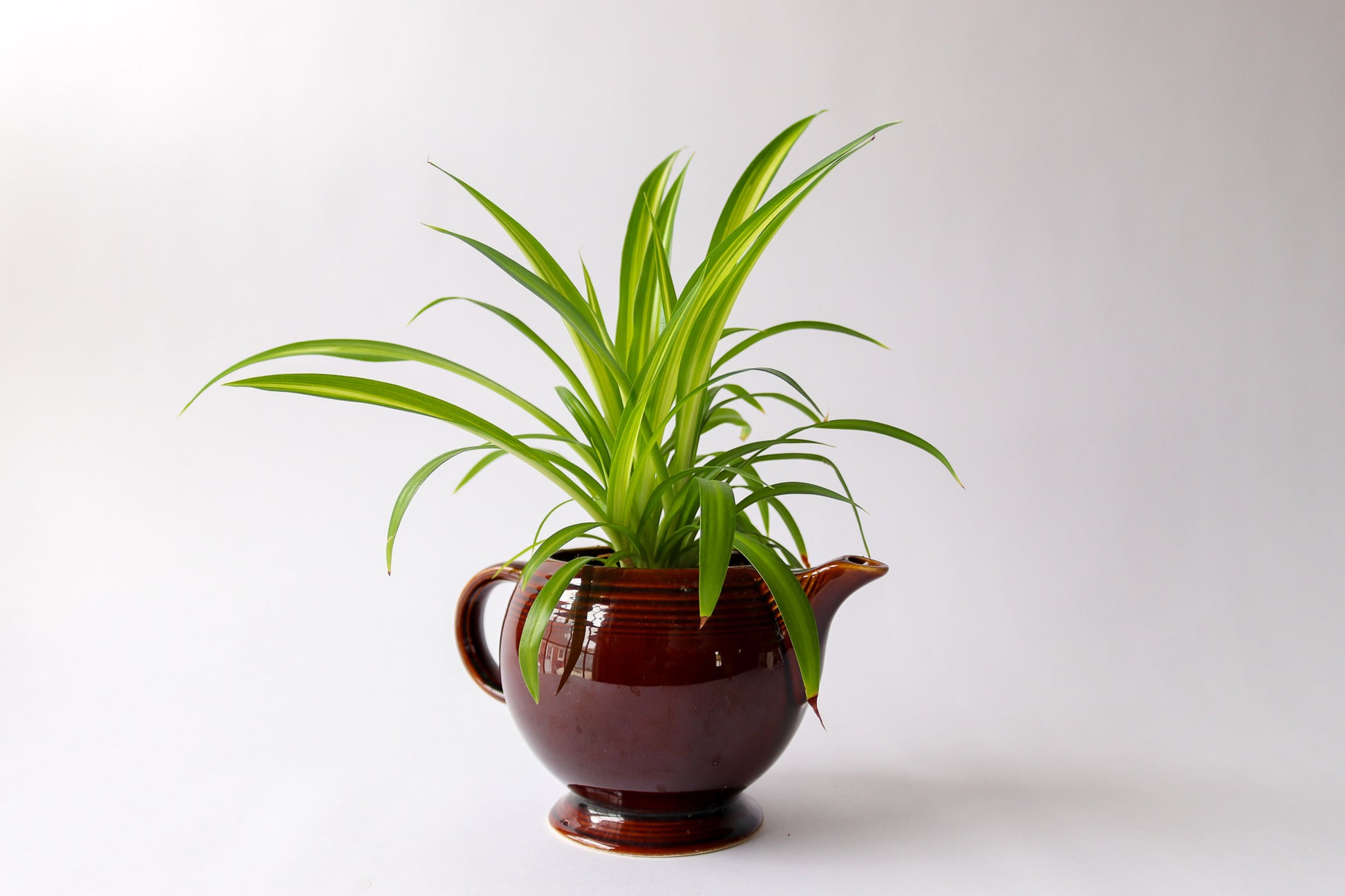 Potted spider plant in a vintage tea pot.